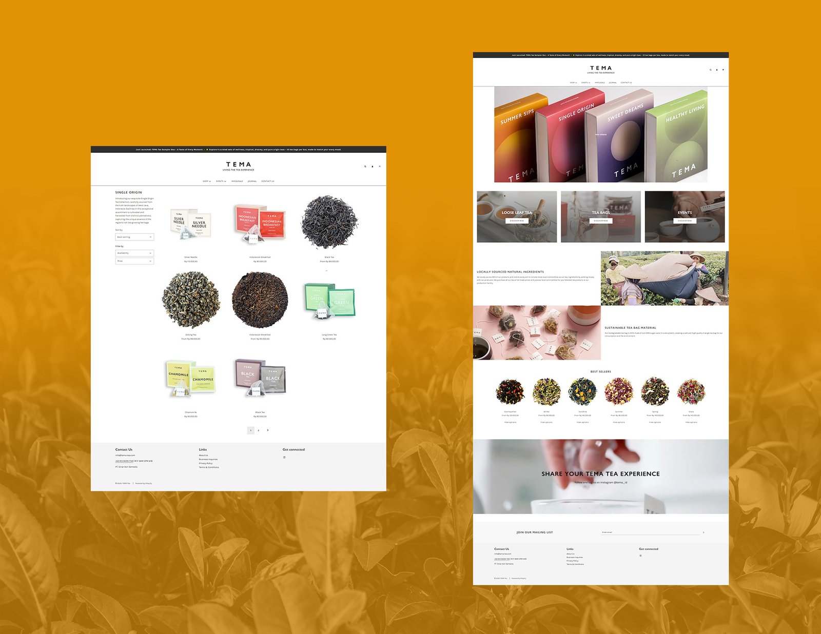 TEMA begon met een eenvoudig doel: het maken van thee van hoge kwaliteit, lokaal geproduceerd. In 2017 waagden wij de stap om de wereld van thee en al haar voordelen te ontdekken. Wat wij daarbij vonden, deed ons beseffen dat TEMA niet alleen werd opgericht om thee van uitstekende kwaliteit te produceren, maar ook om producenten te versterken en de nadruk te leggen op lokaal denken en duurzame verantwoordelijkheid. Sindsdien hebben wij theesoorten zorgvuldig geselecteerd en ambachtelijk samengesteld, steeds trouw aan deze kernwaarden, om u een persoonlijke thee-ervaring te bieden